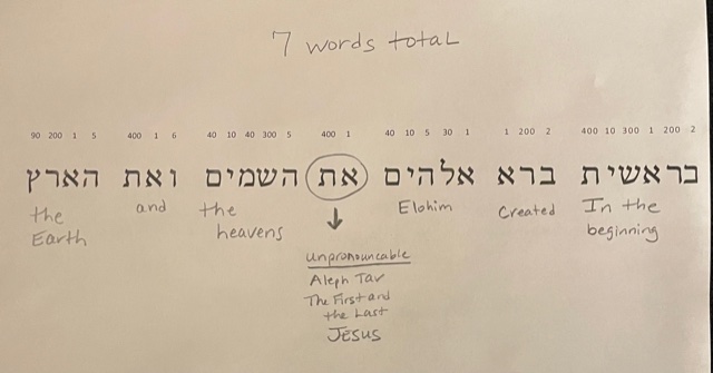 John 1 says Jesus is the Word and he was with God in the beginning. So, in Genesis 1:1 we have two letters forming a word we can’t pronounce, yet we can still see them right there in the middle of the scripture! Those two letters reveal that in the beginning, when God created the heavens and the earth, the aleph (first) and the tav (last) was right there! Jesus was present when God created everything! No wonder Revelation 4:11 says,