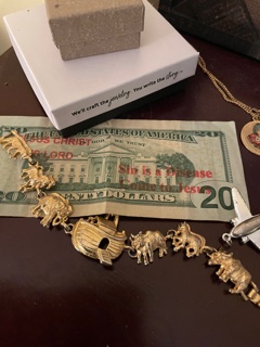 From then on, I put the bill on my jewelry armoire to remind me that Jesus is Lord over the economy and anything that happens to it. Anyway, the picture hit the bill on its way down, as well as my Noah’s Ark bracelet. I also had a little airplane charm on top as a reminder that one day Jesus will “fly” us to heaven. The plane had been knocked all the way off the bill.