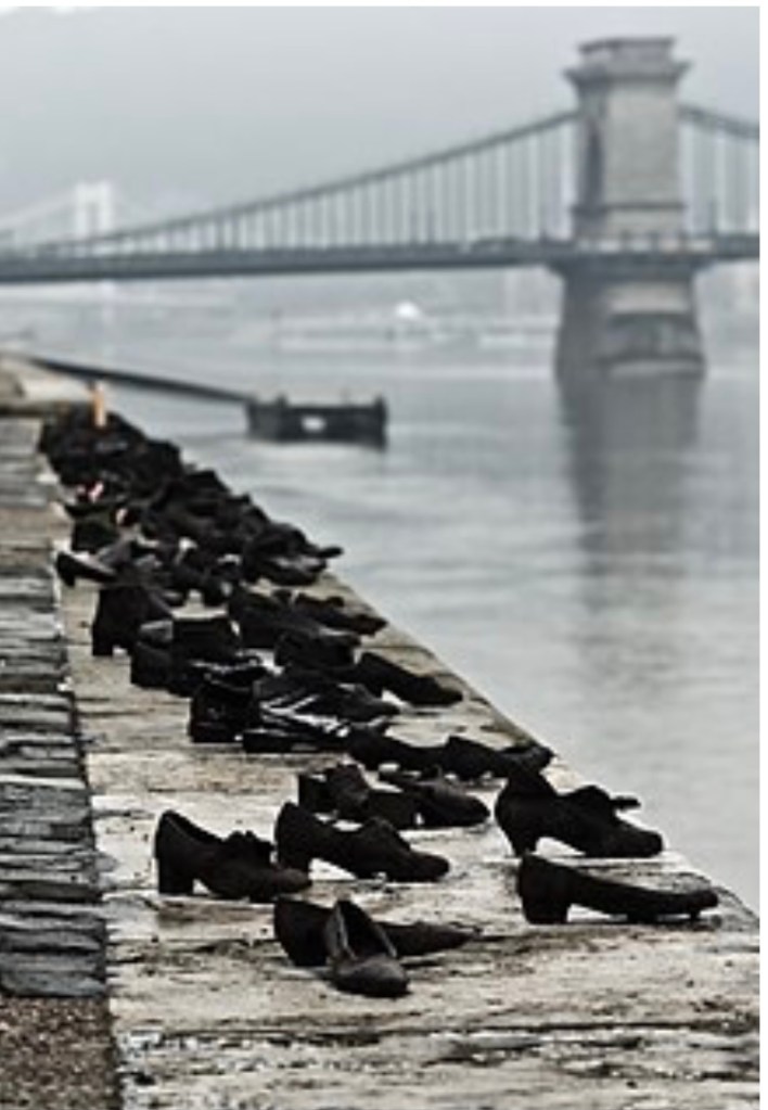 The picture below is from a memorial called Shoes on the Danube Bank in Budapest, Hungary. Sixty pairs of iron shoes were sculpted and attached to the stone embankment along the east bank of the Danube River. The location pays tribute to 3500 people–800 of them Jews– who were shot by Fascist Hungarian soldiers at the edge of the water so that their bodies would fall into the water. Their shoes were left behind.