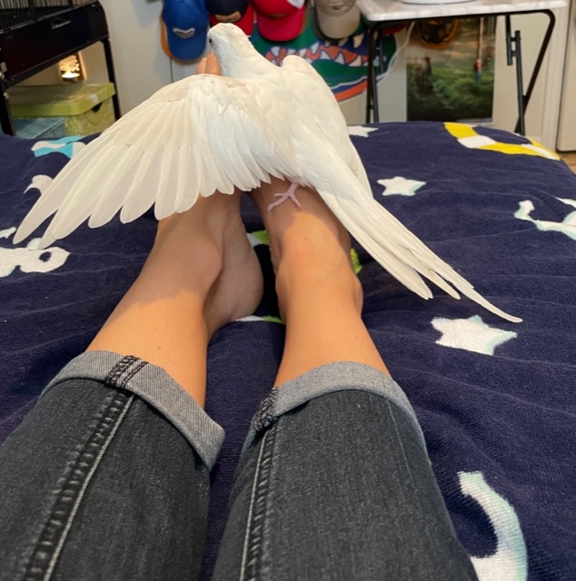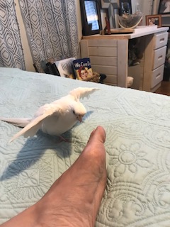 I pick up Casper, who is a beautiful all-white cockatiel, and take him into the living room with me. Right away he starts singing as he walks over to my feet. You see, Casper has a habit most people would find strange. Even the veterinarian thinks it’s unusual. Casper’s weird habit is that he adores feet! The moment he sees my feet, he rushes over and begins spreading his wings over them. He hovers gently and methodically as he sings, “I love you, I love you, I love you.” Next, he kisses my feet and rubs his soft head on them. After a minute or two, he paces back and forth as if guarding my feet from approaching enemies. Then it’s back to hovering over my feet with his wings, while he sings.